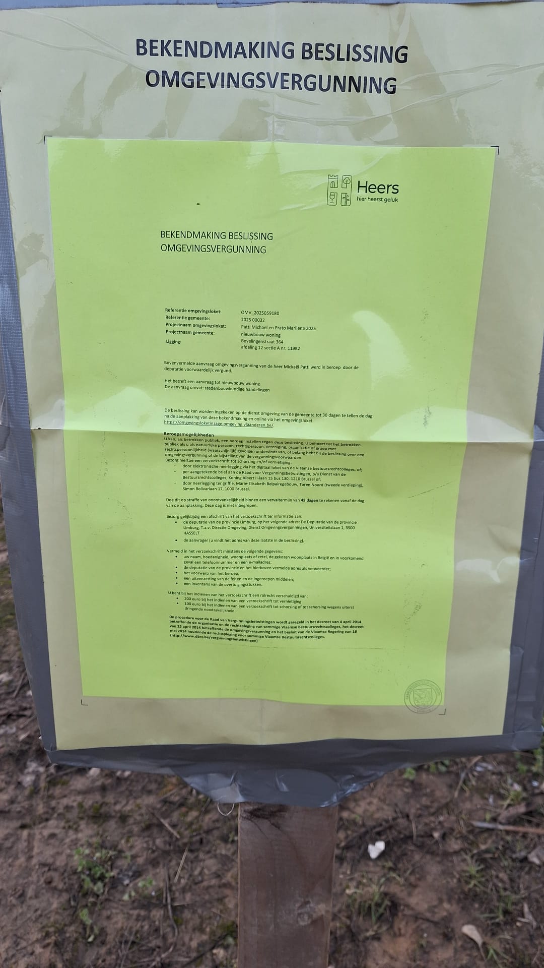 De beslissing kan worden ingekeken op de dienst omgeving van de gemeente Heers tot 30 dagen te tellen de dag na de aanplakking van deze bekendmaking.
